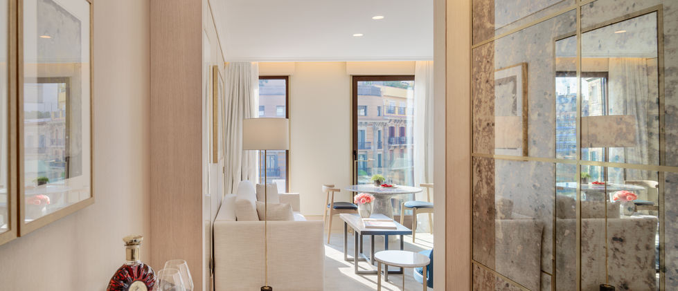 Located on the top floor of the hotel, this spacious suite of 92 m² (990 ft2) opens up to the city thanks to a 32 m² terrace that is accessible from all its rooms and is equipped with a Jacuzzi, sun loungers, a shower and incredible views of the Sagrada Família. Luxurious accommodation comprising a separate 20 m² living room, a sophisticated bedroom with an exclusive bathroom, free-standing bathtub and dressing room. The possibility of connecting to another room makes it a good choice for families who want to maintain their private space. Maximum occupancy: 2 people in the one-bedroom suite, 4 in the two-bedroom suite.